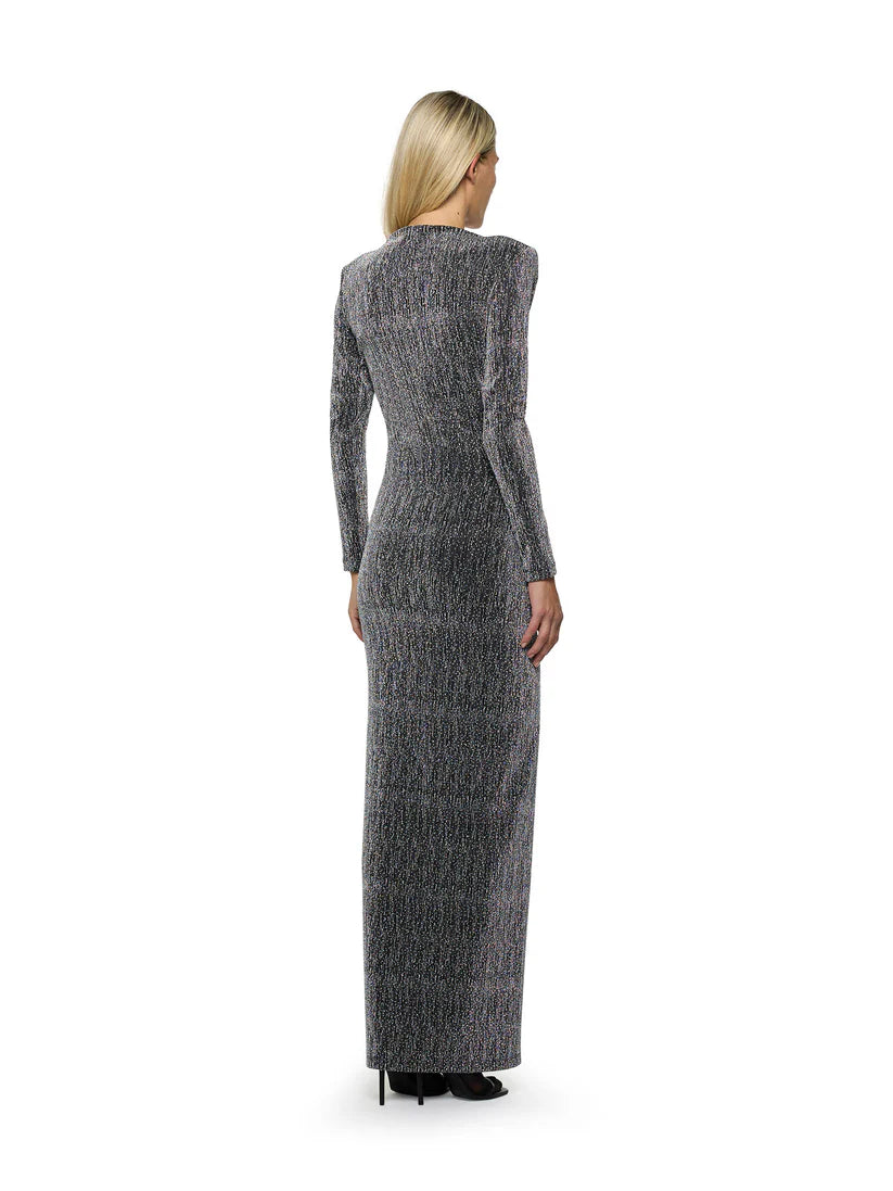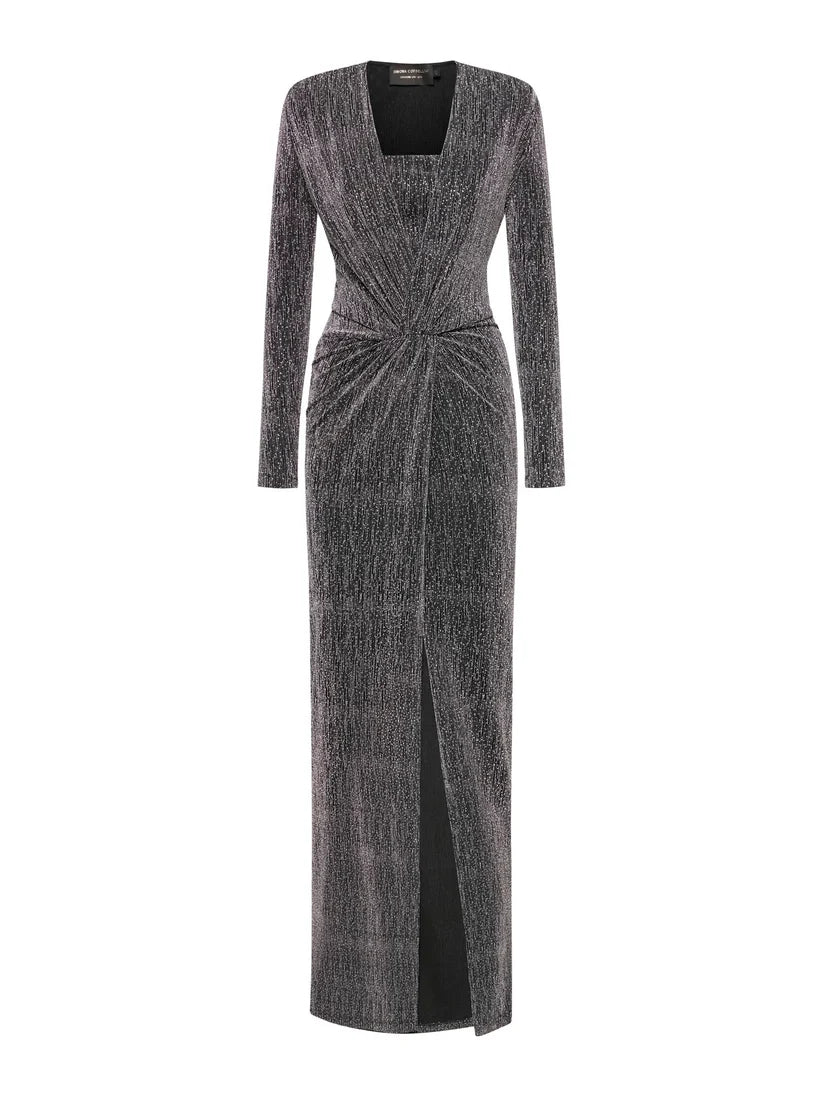 ABITO LUNGO A MANICHE LUNGHE CON NODO FRONTALE E FASCIA IN TESSUTO ELASTICIZZATO CON STRASS SIMONA CORSELLINI